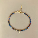Bracelet aux pierres couleurs vert en zoïsite ou violet (rubis et saphir) délicatement agrémenté d’un discret pétale en argent massif plaqué en or 24K. facile à merier avec d’autres bracelets.