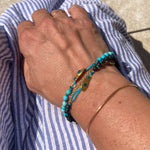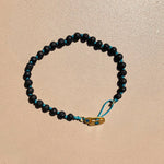 Bracelet en perles de lave assemblées sur un fil en coton huilé turquoise qui évoque l’aspect brut et noir propre à l’île de Milos.