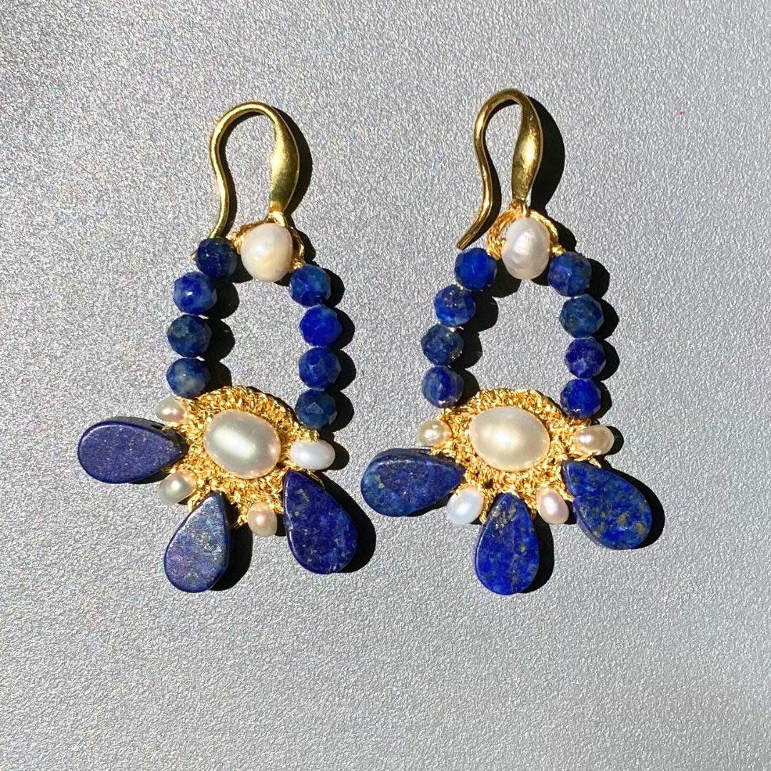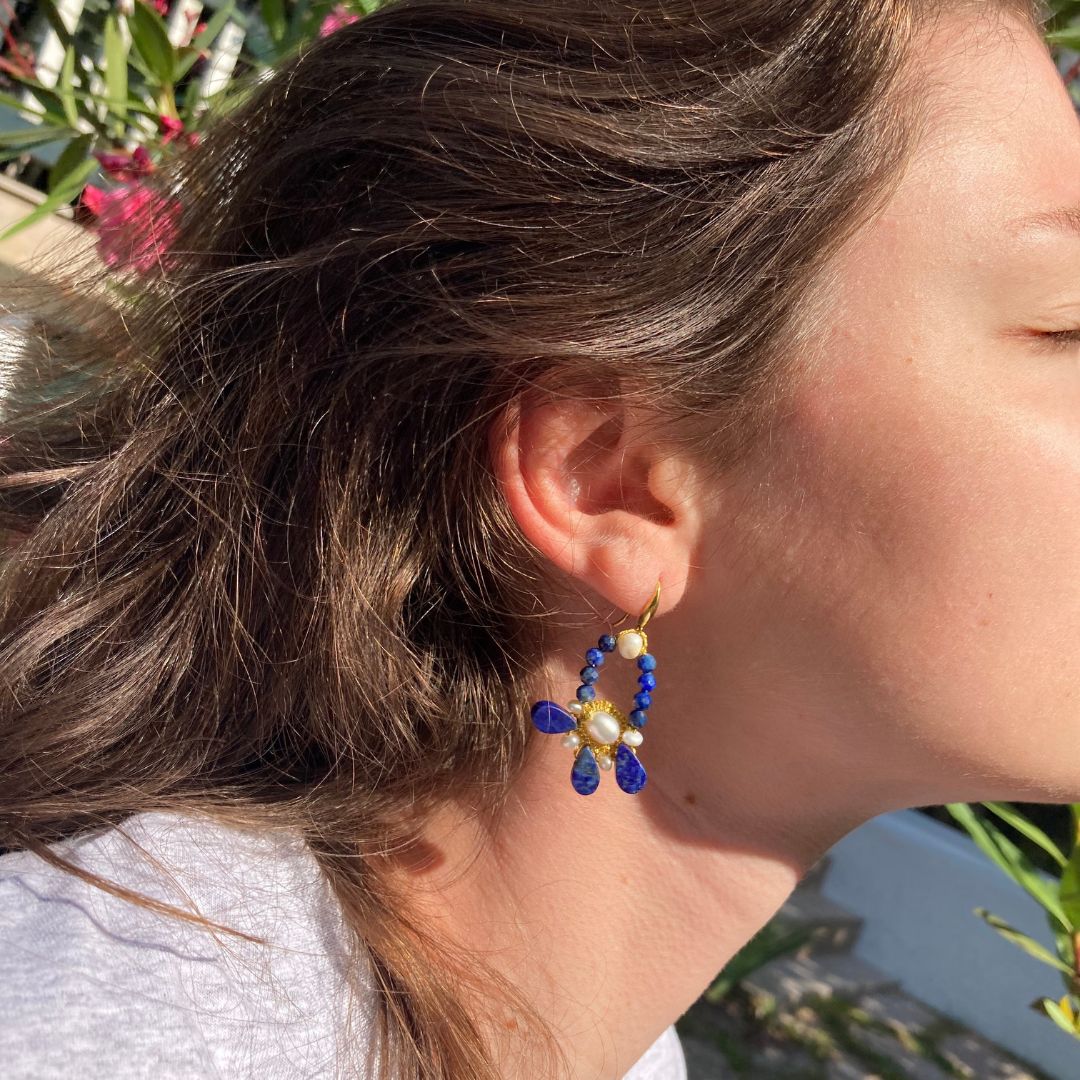 Sofia Papakosta évoque cette figure avec la féminité de ces boucles, la lumière des perles en nacre et la puissance du lapis lazuli.